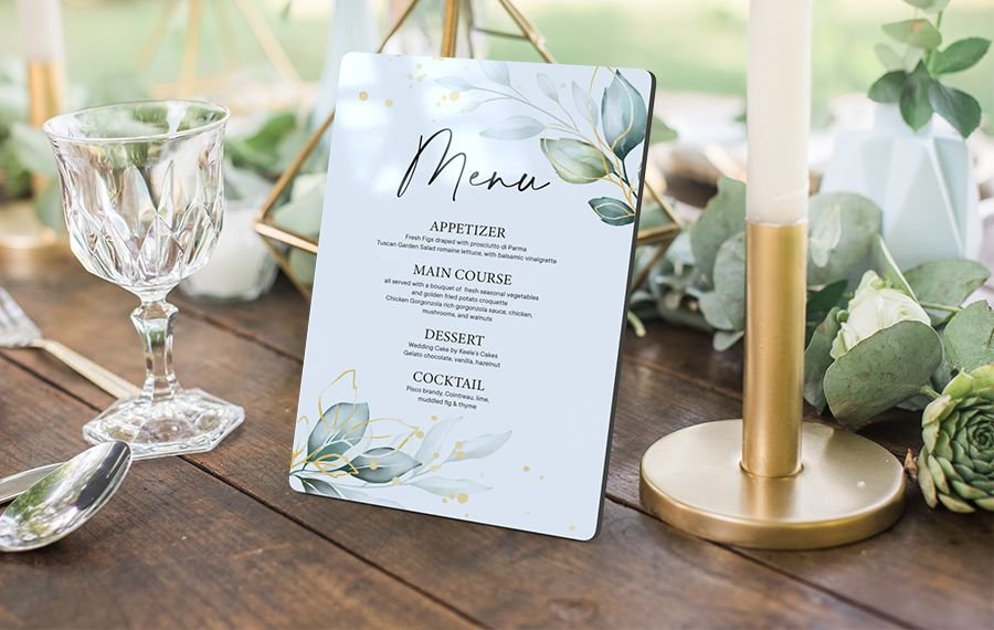 Bei besonderen Anlässen zählen die kleinen Details, die für das perfekte Ambiente sorgen. Gestalte deine Menü- oder Getränkekarte für die Hochzeit, die Themenparty oder den runden Geburtstag als individuelles Fotodisplay. Mit einem einfachen Bildbearbeitungsprogramm kombinierst du den gewünschten Text mit einem passenden Hintergrundfoto. Die fertige JPG-Datei speicherst du anschließend ab, lädst sie im Gestaltungseditor hoch – und schon entsteht mit wenigen Klicks deine persönliche Menükarte als stilvoller Fotoaufsteller.
