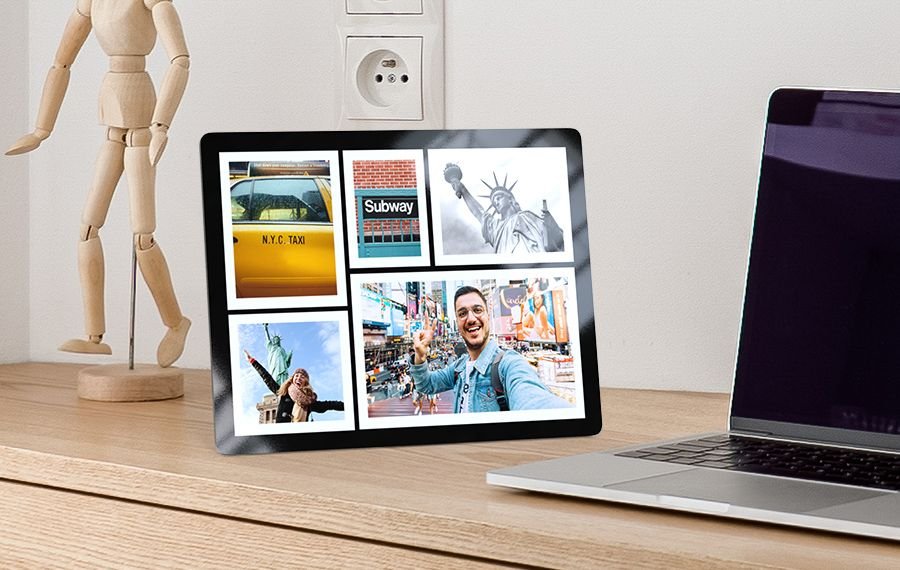 Ein Blick auf schöne Erinnerungen gibt dir Energie und sorgt für gute Laune im Büro. Gestalte dein Fotodisplay als farbenfrohe Collage mit deinen Lieblingsfotos – so verleihst du deinem Arbeitsplatz eine ganz persönliche Note. Wähle aus verschiedenen Layouts dein Wunschdesign und setze deine Bilder kreativ auf dem Fotoaufsteller in Szene.